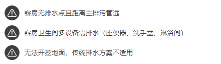 然而在装修阶段,因酒店内部结构复杂,十多个客房卫生间无排水点以及距离主排污管较远,且受限于大楼装修限制,无法进行地面开挖铺设管道,排水难题亟待解决。